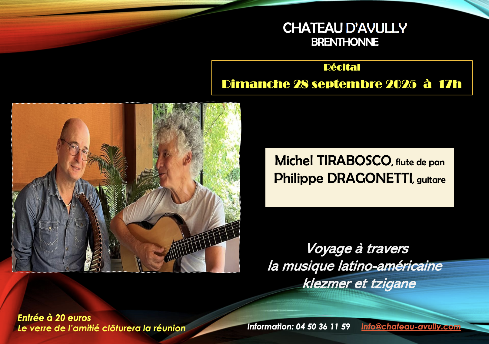 Michel TIRABOSCO (flûte de pan) et Philippe DRAGONETTI (guitare) vous emmènent dans un magnifique « Voyage à travers la musique latino-américaine » avec des mélodies klezmer et tzigane qui réchaufferont vos cœurs.